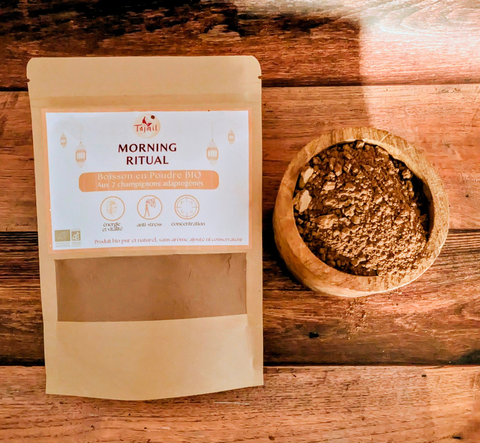 LE MORNING RITUAL (Pour le Suhoor) : Votre allié du matin, une boisson aux champignons adaptogènes qui remplace le café. Fini les maux de tête, place à la concentration. Il vous offre une énergie stable et durable et nourrit votre corps pour la journée de jeûne.